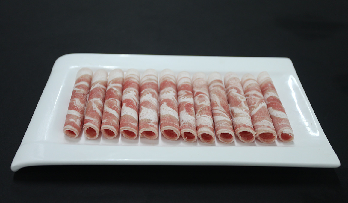 選用羔羊完整腰背連接腹部肌肉。脂肪向外,脂肪厚度0.5㎝-0.8㎝,切片后外肥里瘦,呈太陽狀,適合涮食、煎烤。