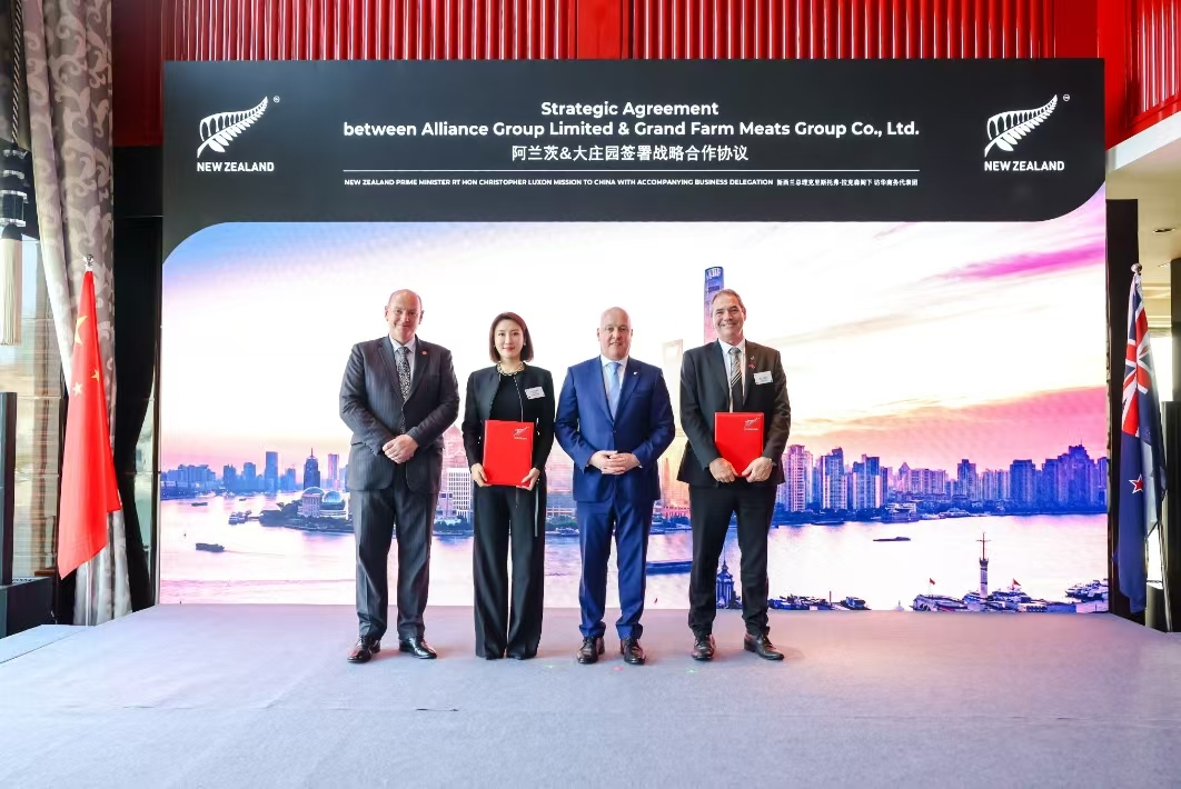 2025年6月,首次訪華的新西蘭總理克里斯托弗?拉克森在上海開(kāi)展了一系列商務(wù)活動(dòng)。大莊園集團(tuán)作為行業(yè)龍頭企業(yè),憑借其30年在國(guó)際貿(mào)易中做出的貢獻(xiàn),在拉克森總理的見(jiàn)證下與新西蘭阿蘭茨集團(tuán)簽訂了戰(zhàn)略升級(jí)協(xié)議,并得到新西蘭肉協(xié)官方授牌。